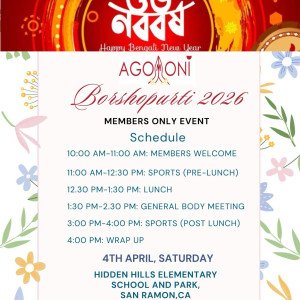 We cordially invite you and your family to Agomoni Borshopurti on Saturday, April 4th, 2026. This will be a member-only event. RSVP by March 27th. We look forward to celebrating with… ...